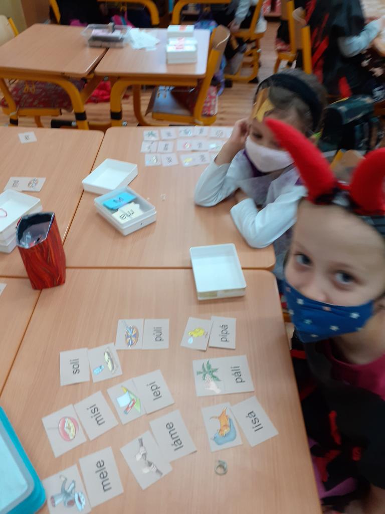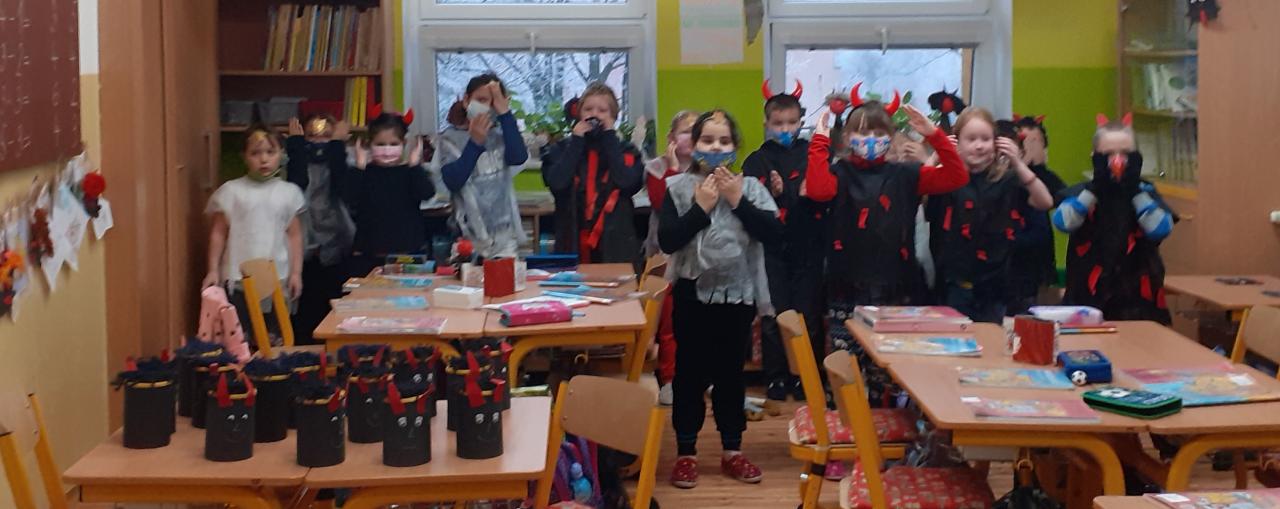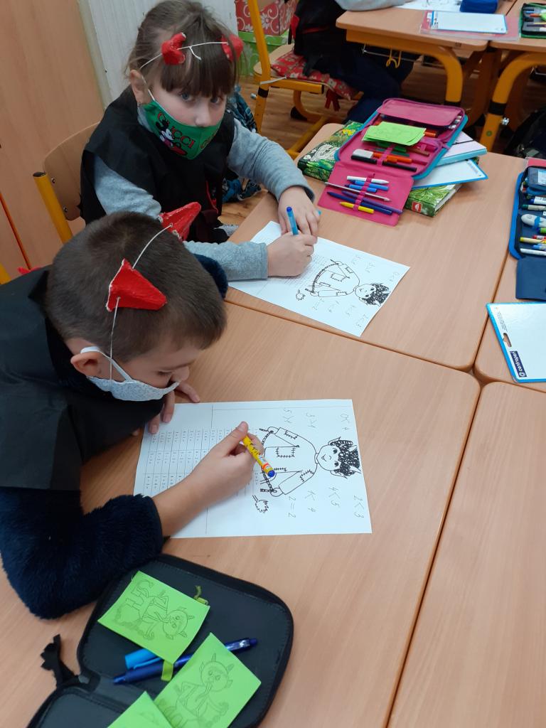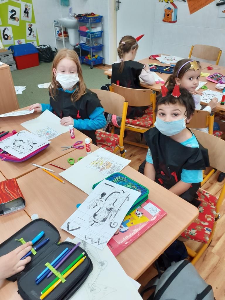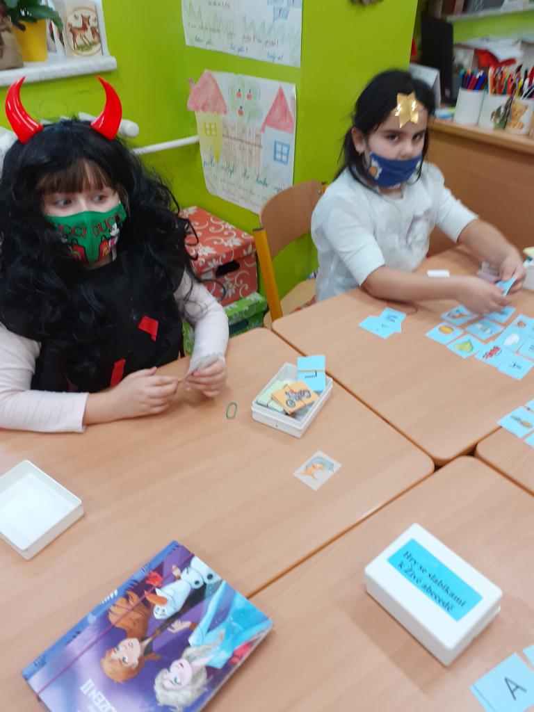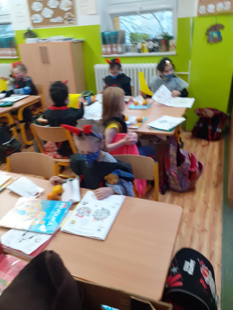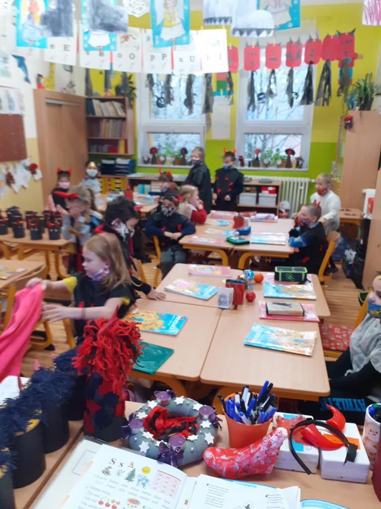 V pondělí 30. listopadu se 1.B. proměnila v čertí třídu. Pekelnice (třídní učitelka) rozdala dětem růžky, hvězdičky í kostýmy a rázem byla třída plná čertíků a andílků. Čerti z pekla pro děti připravili spoustu úkolů. Úkoly na den se děti dozvěděly vždy ráno z čertích dopisů. Malí čertíci, andílci skládali puzzle s motivy čertů, psali první písmenka, slabiky, slova, vyplňovali čertovskou křížovku, četli čertovské slabiky, slova, v matematice vybarvovali čertí obrázky podle výsledků matematických příkladů, řešili čertí slovní úlohy. Čerti nevynechali žádný předmět a tak i při pracovních činnostech, výtvarné výchově, tělesné výchově a hudební výchově se řádilo pekelně.