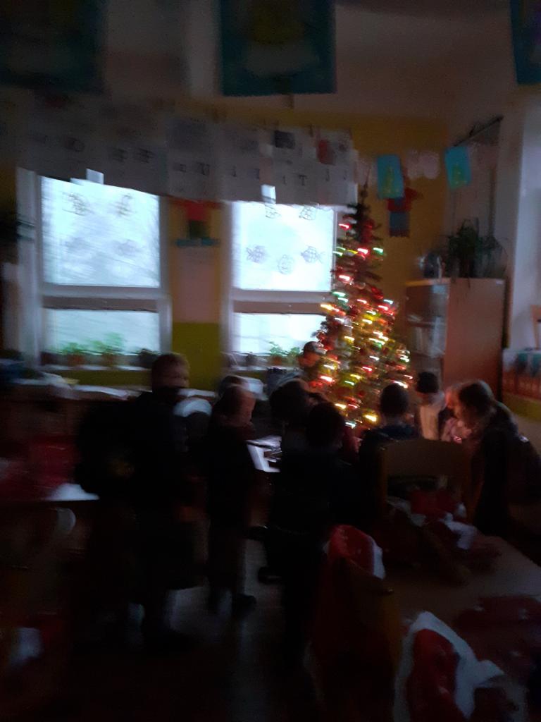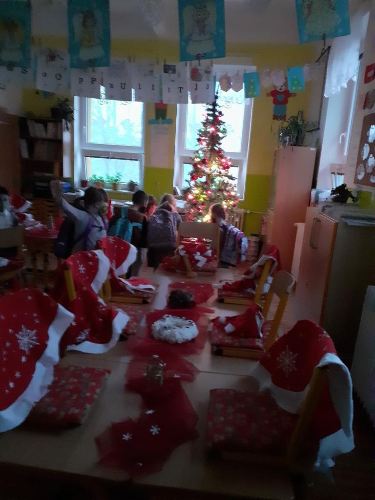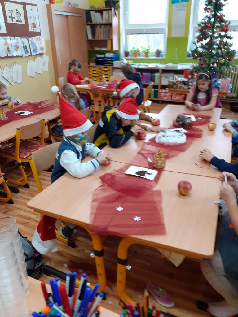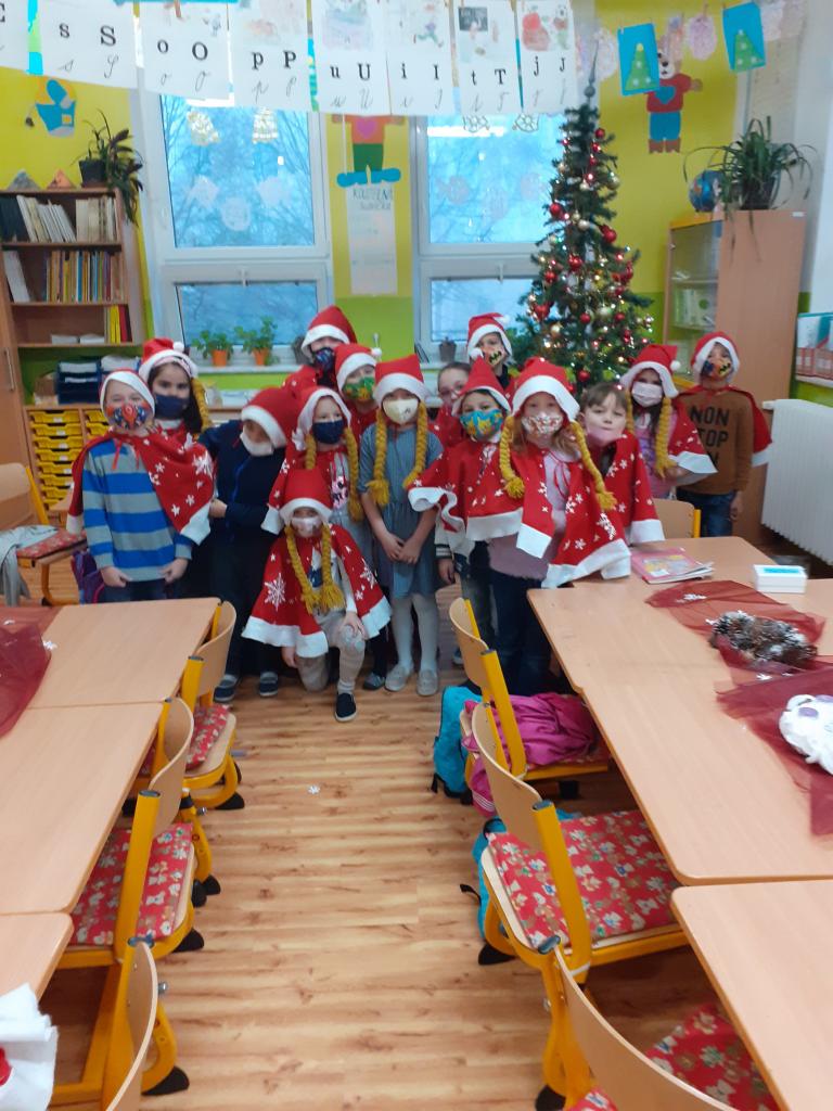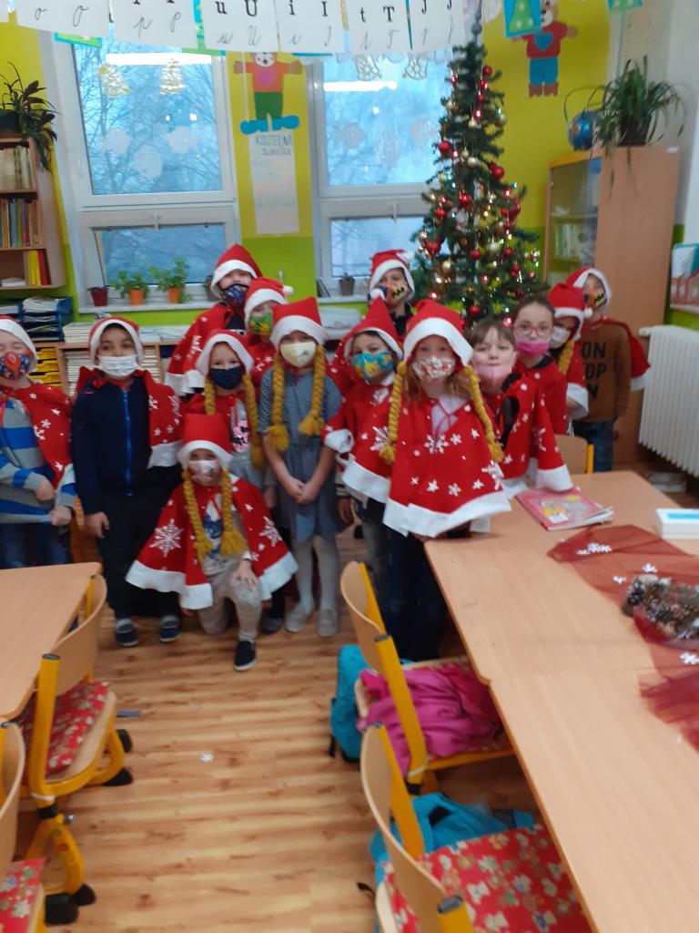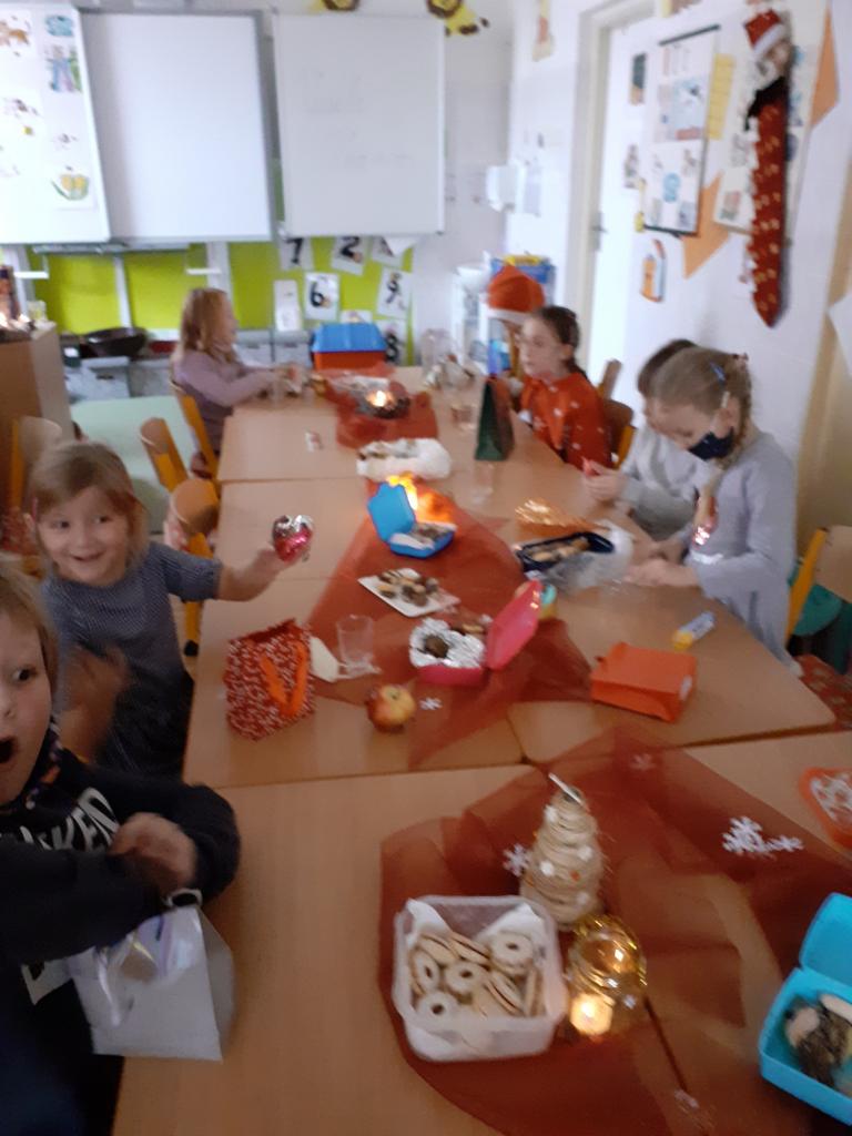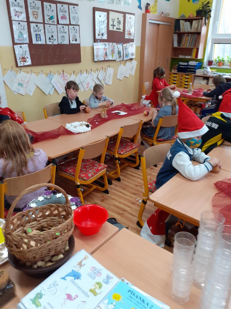 V pátek 18. 12. jsme strávili krásný Štědrý den ve škole. Náš první společný. Myslím si, že se moc pěkně vydařil a všichni jsme si jej užili. Ráno byla naše třída zamčená a nemohli jsme jí otevřít. Děti poslouchaly za dveřmi a slyšely nějaké rány, šramocení. Když jsme třídu otevřeli, čekalo na nás překvapení. Krásný rozsvícený stromeček s dárečky a slavnostně prostřená tabule. Co nás čekalo dále? Pověděli jsme si o životě Ježíška, poznali jsme mnoho zvyků, které si žáci možná vyzkoušeli i doma na Štědrý den. Víme, jaký poklad je jmelí, umíme vyrobit lodičku ze skořápek – naše lodičky ve škole se držely pohromadě, budeme tedy spolu celý další rok pobývat ve třídě v radosti. Víme, co znamená hvězdička v rozkrojeném jablíčku i zdravé jádro vlašského oříšku. My Skřítkové budeme po celý rok zdraví, jablíčko nám to prozradilo. Střevíček nám pověděl, jestli se vdáme nebo zamilujeme a lití vosku místo olova ukázalo také pěkné vyhlídky do budoucna. Vyrobili jsme si každý voňavé jablíčko a malé přáníčko. Povyprávěli jsme si, jak čekáme na Ježíška, jestli jsme psali nebo malovali dopis, kdo Ježíška už zahlédl a jak dává vědět, že už nadělil dárečky. Zavzpomínali jsme na všechny, které máme rádi a natěšili se na štědrovečerní večeři po celodenním půstu. Někdo se pochlubil, že viděl i zlaté prasátko. Známe i pár zvyklostí z oslav Vánoc z jiných zemí. A samozřejmě pochoutky nesměly chybět i na našich stolečcích. Svačinka byla opravdu vánoční. Vůně čajíků, vánočního cukroví a smrkových větviček provoněla celou třídu. Někteří se vůbec nemohli dočkat hodiny, kdy jsme si rozdávali dárečky. Každý dostal dárečky od školního Ježíška. Našli jsme pod stromečkem hru Mikádo (kterou hrají prvňáčkové každou přestávku) - to bylo radosti, puzzle a bublifuk. Děti si mezi sebou rozdaly také dárečky, kterými se navzájem obdarovaly. Děti vypadaly šťastně. Jsem moc ráda, že jsme tento den prožili naplno a ve velké radosti. Očička jen zářila.