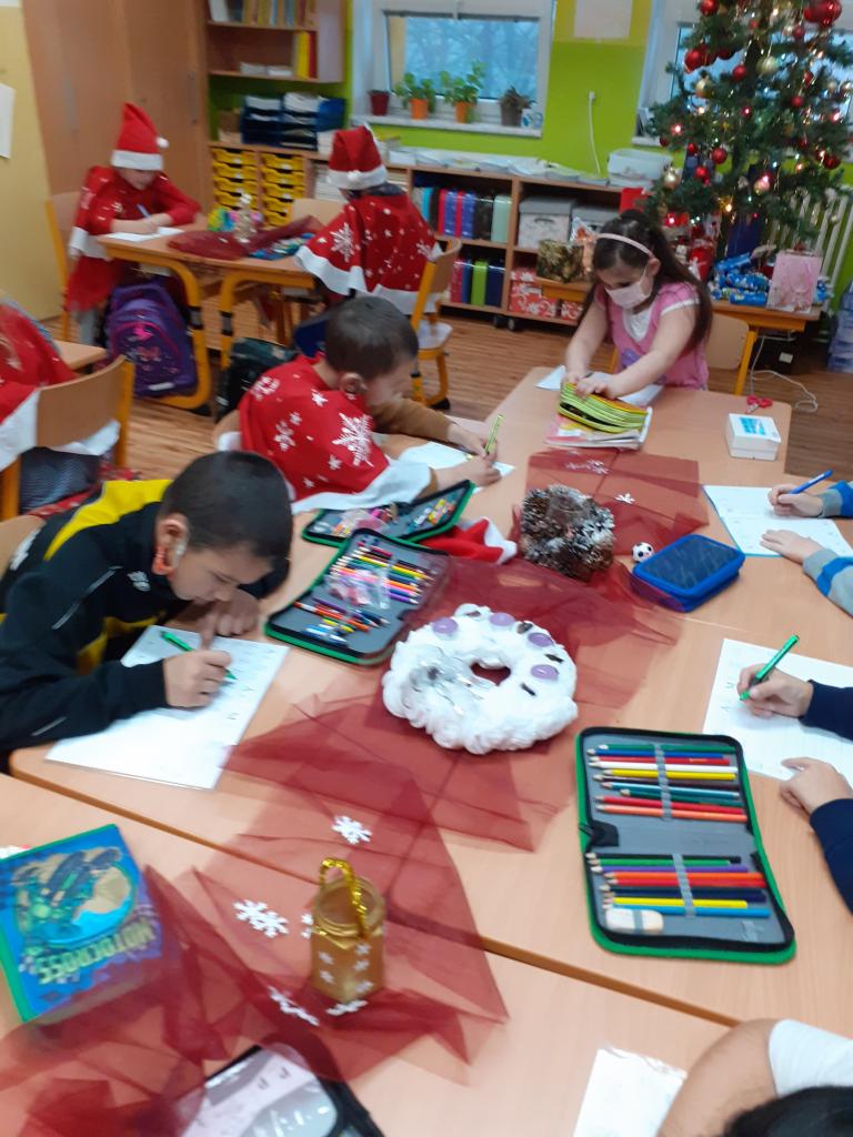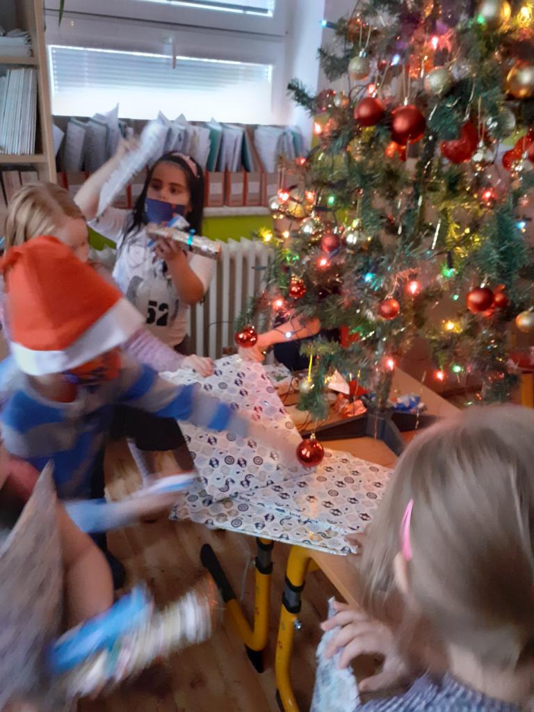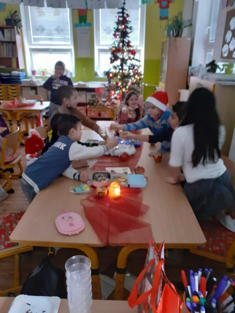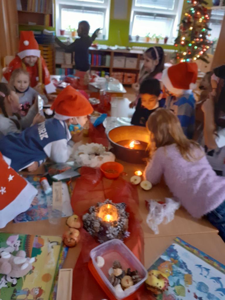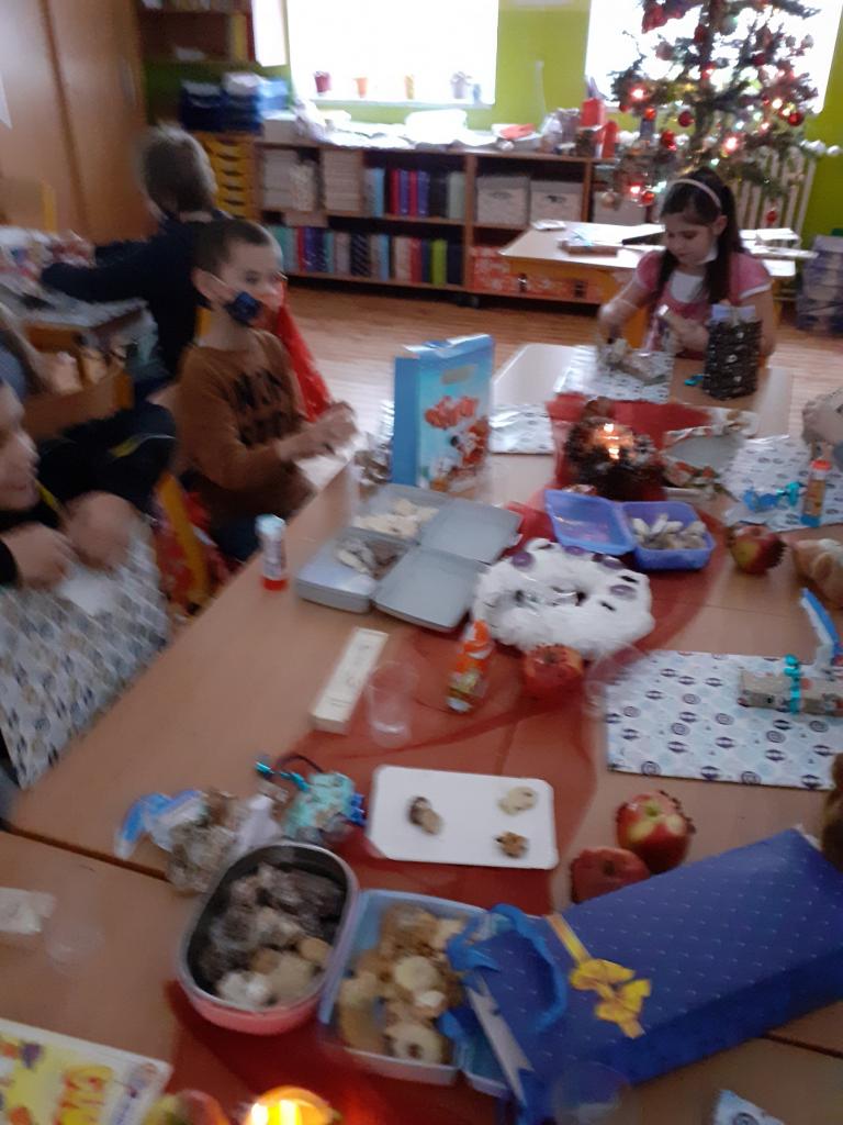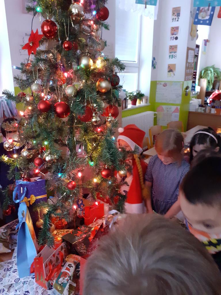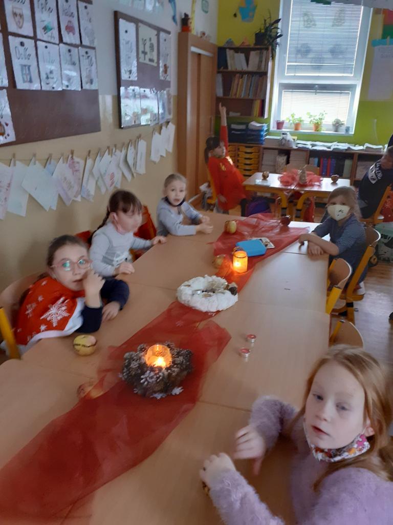 V pátek 18. 12. jsme strávili krásný Štědrý den ve škole. Náš první společný. Myslím si, že se moc pěkně vydařil a všichni jsme si jej užili. Ráno byla naše třída zamčená a nemohli jsme jí otevřít. Děti poslouchaly za dveřmi a slyšely nějaké rány, šramocení. Když jsme třídu otevřeli, čekalo na nás překvapení. Krásný rozsvícený stromeček s dárečky a slavnostně prostřená tabule. Co nás čekalo dále? Pověděli jsme si o životě Ježíška, poznali jsme mnoho zvyků, které si žáci možná vyzkoušeli i doma na Štědrý den. Víme, jaký poklad je jmelí, umíme vyrobit lodičku ze skořápek – naše lodičky ve škole se držely pohromadě, budeme tedy spolu celý další rok pobývat ve třídě v radosti. Víme, co znamená hvězdička v rozkrojeném jablíčku i zdravé jádro vlašského oříšku. My Skřítkové budeme po celý rok zdraví, jablíčko nám to prozradilo. Střevíček nám pověděl, jestli se vdáme nebo zamilujeme a lití vosku místo olova ukázalo také pěkné vyhlídky do budoucna. Vyrobili jsme si každý voňavé jablíčko a malé přáníčko. Povyprávěli jsme si, jak čekáme na Ježíška, jestli jsme psali nebo malovali dopis, kdo Ježíška už zahlédl a jak dává vědět, že už nadělil dárečky. Zavzpomínali jsme na všechny, které máme rádi a natěšili se na štědrovečerní večeři po celodenním půstu. Někdo se pochlubil, že viděl i zlaté prasátko. Známe i pár zvyklostí z oslav Vánoc z jiných zemí. A samozřejmě pochoutky nesměly chybět i na našich stolečcích. Svačinka byla opravdu vánoční. Vůně čajíků, vánočního cukroví a smrkových větviček provoněla celou třídu. Někteří se vůbec nemohli dočkat hodiny, kdy jsme si rozdávali dárečky. Každý dostal dárečky od školního Ježíška. Našli jsme pod stromečkem hru Mikádo (kterou hrají prvňáčkové každou přestávku) - to bylo radosti, puzzle a bublifuk. Děti si mezi sebou rozdaly také dárečky, kterými se navzájem obdarovaly. Děti vypadaly šťastně. Jsem moc ráda, že jsme tento den prožili naplno a ve velké radosti. Očička jen zářila.
