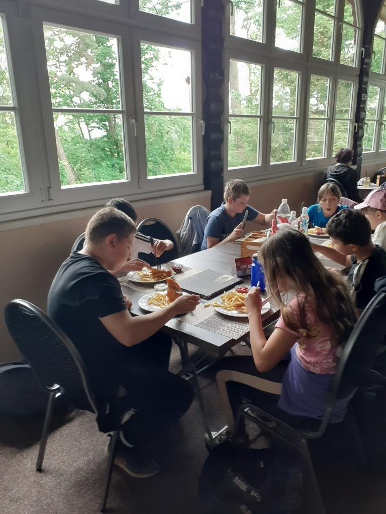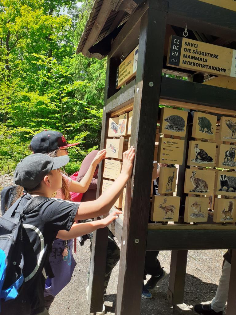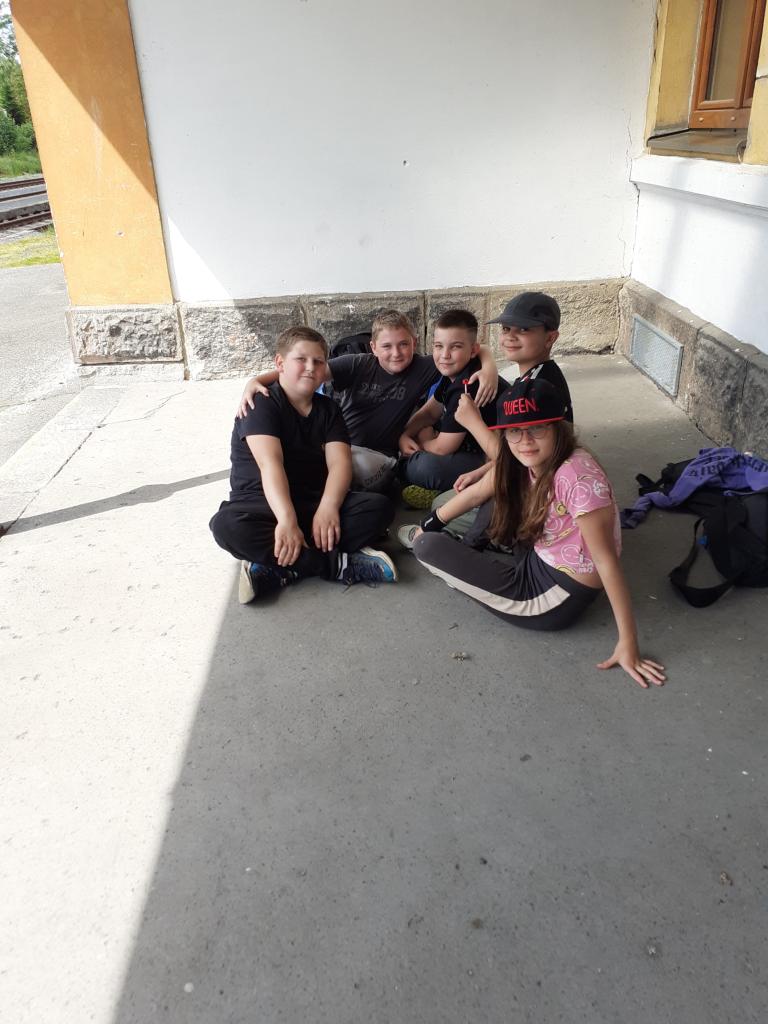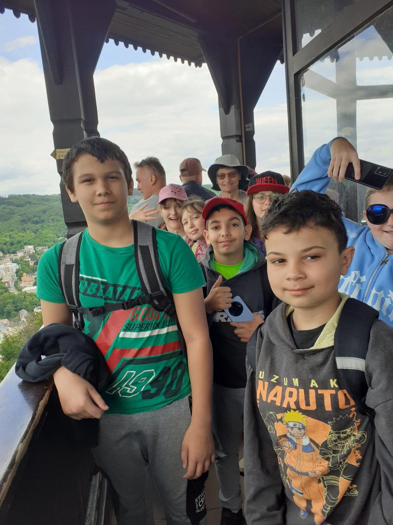 Tajemná výprava začala společnou snídani ( dobroty od maminek) Po snídaní byla rychlá ranní hygiena, někteří z nás chystali tousty na cestu. Byl krásný den a naše dobrodružství začalo v 9:05 hodin, kdy jsme odjeli vlakem z Teplé. Všichni jsme byli natěšení, protože nás čekalo město plné historie, lázeňské atmosféry a zajímavých míst. Po příjezdu do Karlových Varů jsme se nejprve vydali na lázeňskou kolonádu. Procházeli jsme kolem elegantních sloupových staveb, viděli různé prameny a obdivovali slavné Vřídlo, které tryskalo horkou vodu vysoko do vzduchu. Ta síla přírody nás fascinovala. Potom jsme nasedli na lanovku, která nás vyvezla až k rozhledně Diana. Zde na nás čekal v restauraci výborný oběd (kuřízek a hranolky). Výhled z vrcholu rozhledny Diana byl nádherný – celé Karlovy Vary jsme měli jako na dlani. Po prohlídce rozhledny jsme se přesunuli do Motýlího domu. Ten byl jako z jiného světa – kolem nás poletovali pestrobarevní motýli, kteří někdy i přistáli na našich rukách, hlavách. Bylo to kouzelné a klidné místo. Následovala prohlídka mini ZOO. Po té jsme se vydali na procházku přírodou – lesní stezkou Linhart. Cesta nás vedla lesem, kolem výběhů s divokou zvěří. Občas jsme zahlédli laně nebo muflony a užívali si čerstvý vzduch a klid lesa. Bylo to krásné zakončení celého dne. Výlet do Karlových Varů byl plný zážitků, krásných míst a nezapomenutelné atmosféry. Do školy, kde nás čekala druhá noc spaní, jsme se vraceli unavení, ale plní dojmů a s úsměvem na tváři. Tahle tajemná výprava nám zůstane dlouho v paměti.